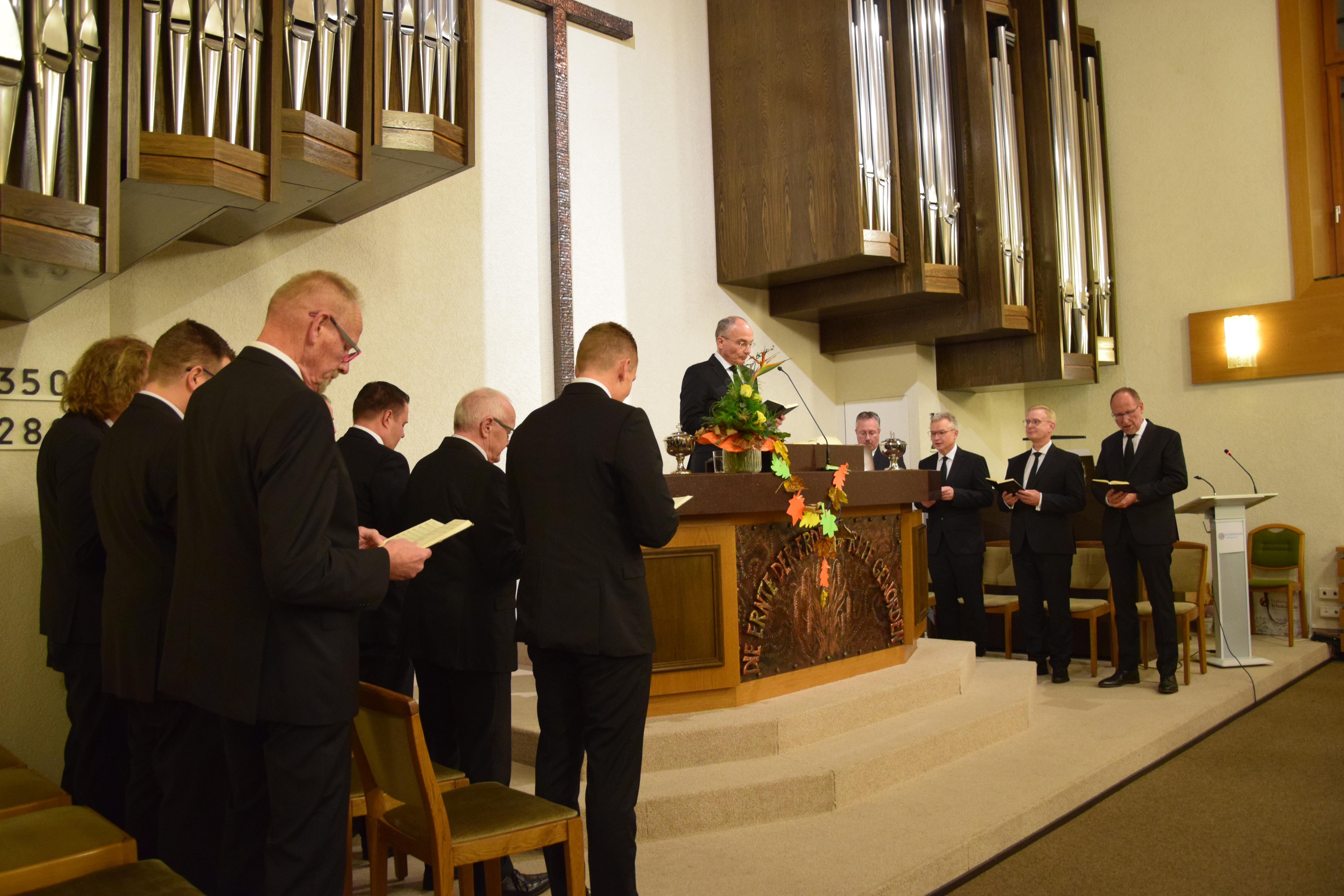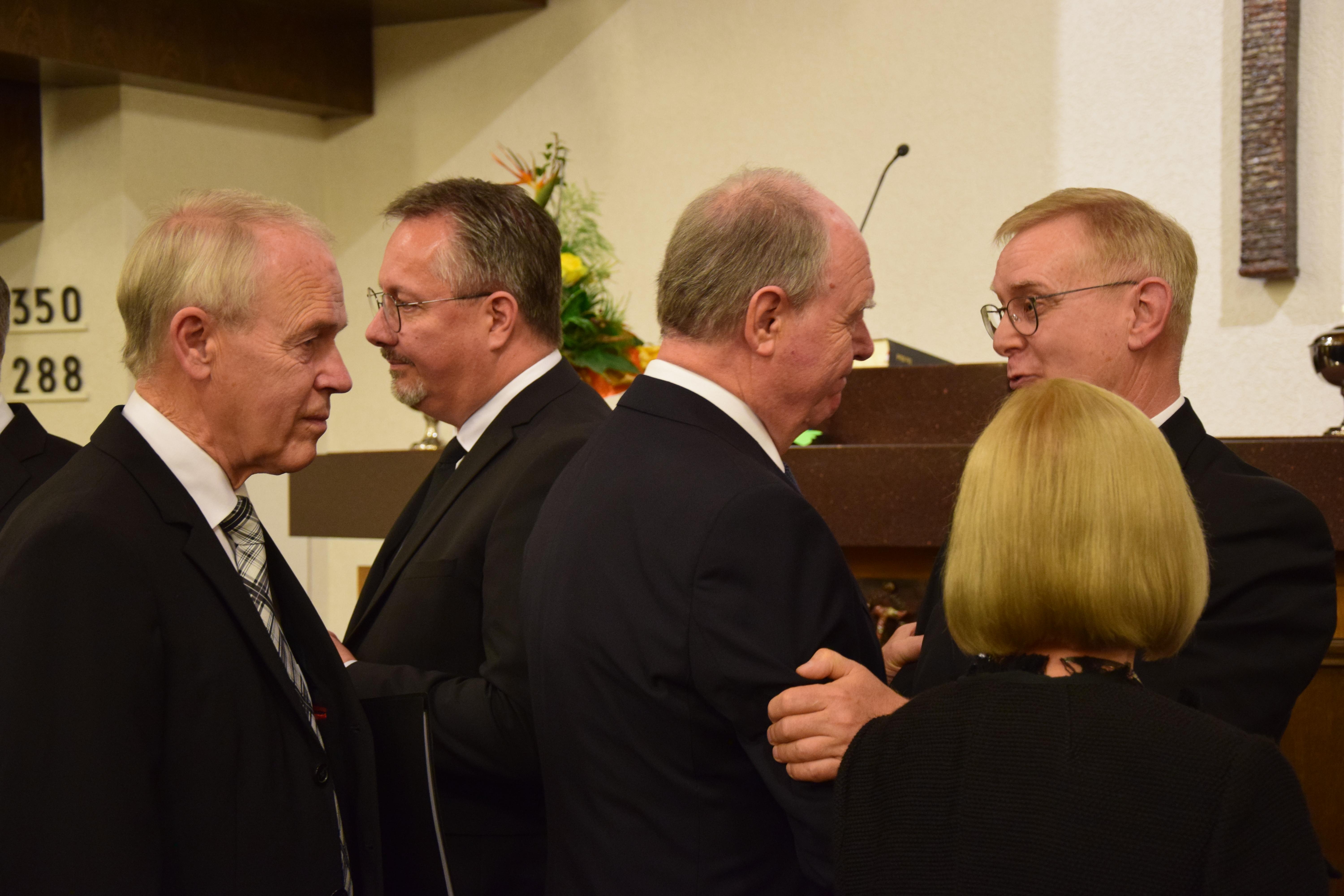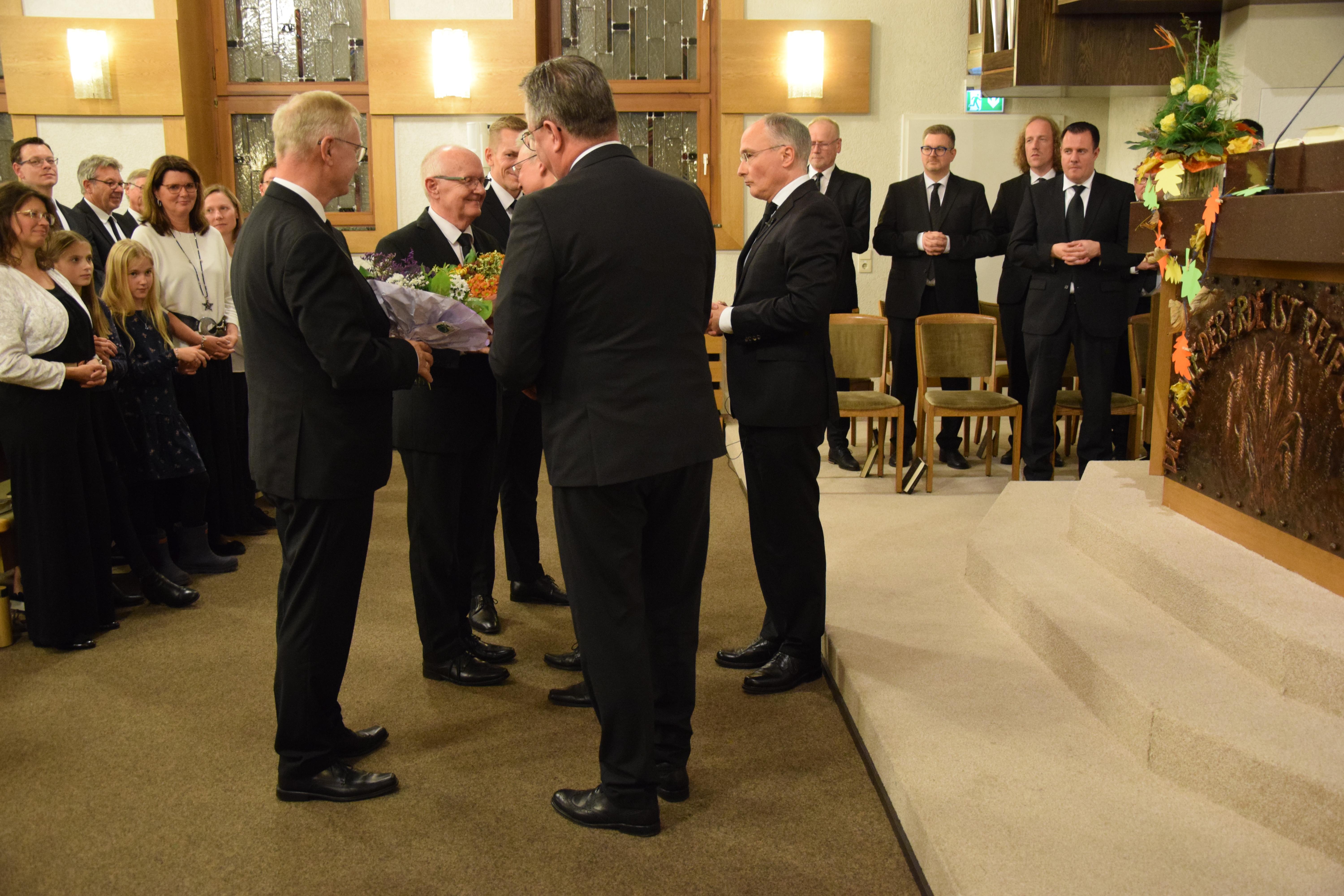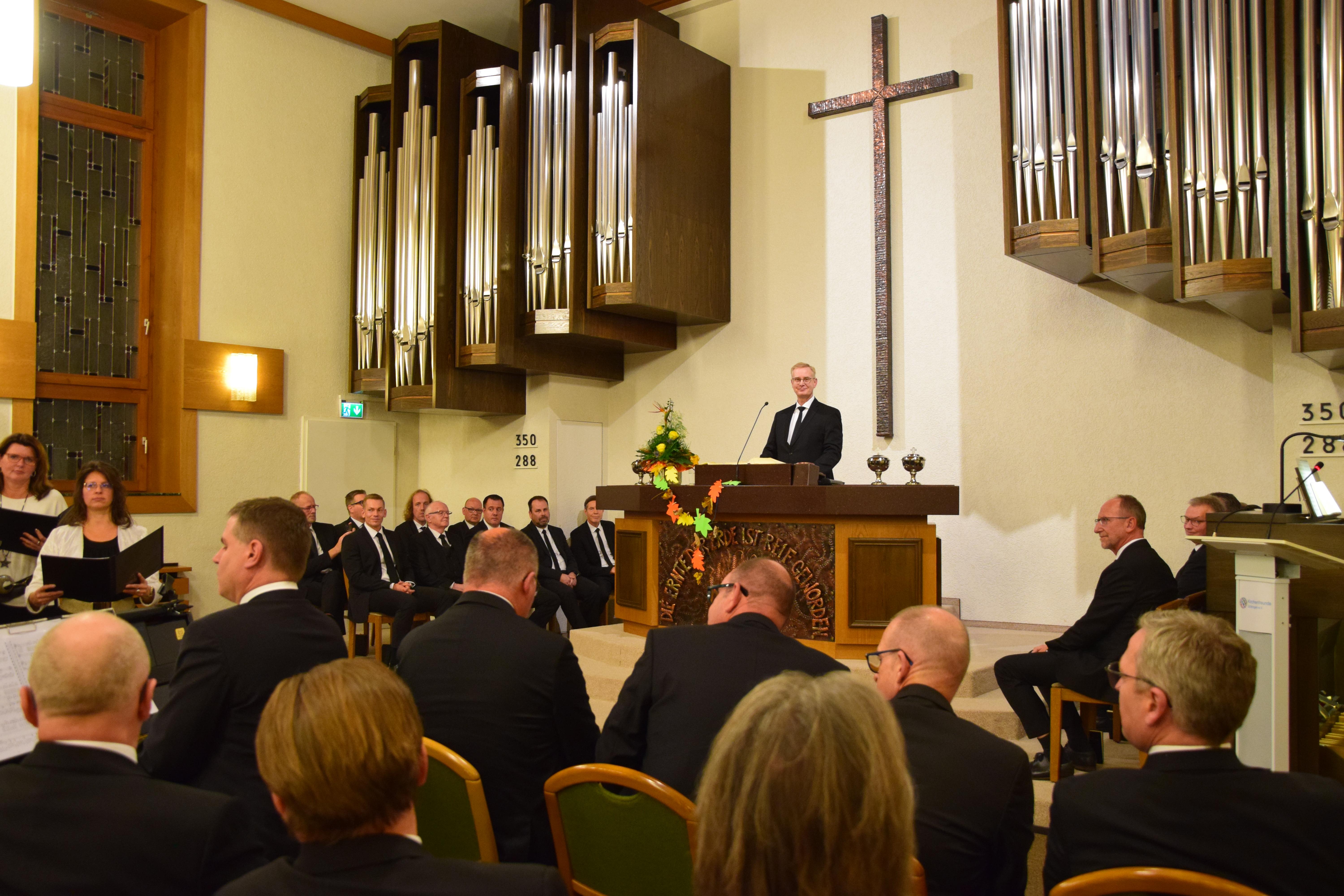 Nach der Feier des Heiligen Abendmahls versetzte der Stammapostelhelfer die beiden Geistlichen in den Ruhestand: Joachim Richter sagte vor 41 Jahren und Uwe Eggers vor 45 Jahren ihr „Ja“ zu ihrem ersten Amtsauftrag. In persönlichen, wertschätzenden Dankesworten zählte er die vielen Stationen dieser beiden Amtstätigkeiten auf, die oftmals mit weiten Wegen und großer persönlicher Opferbereitschaft der beiden ehrenamtlichen Geistlichen sowie deren Familien verbunden waren.