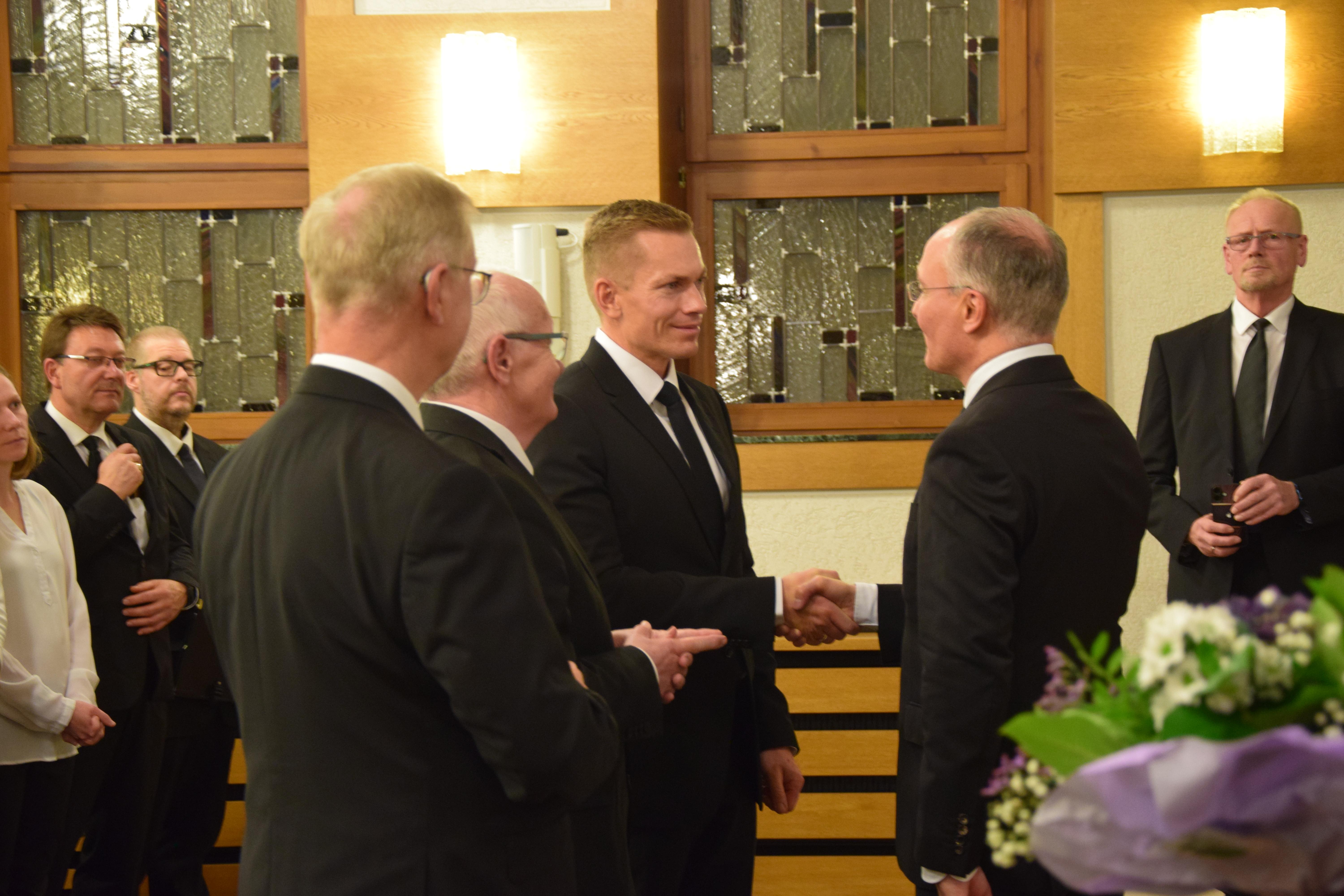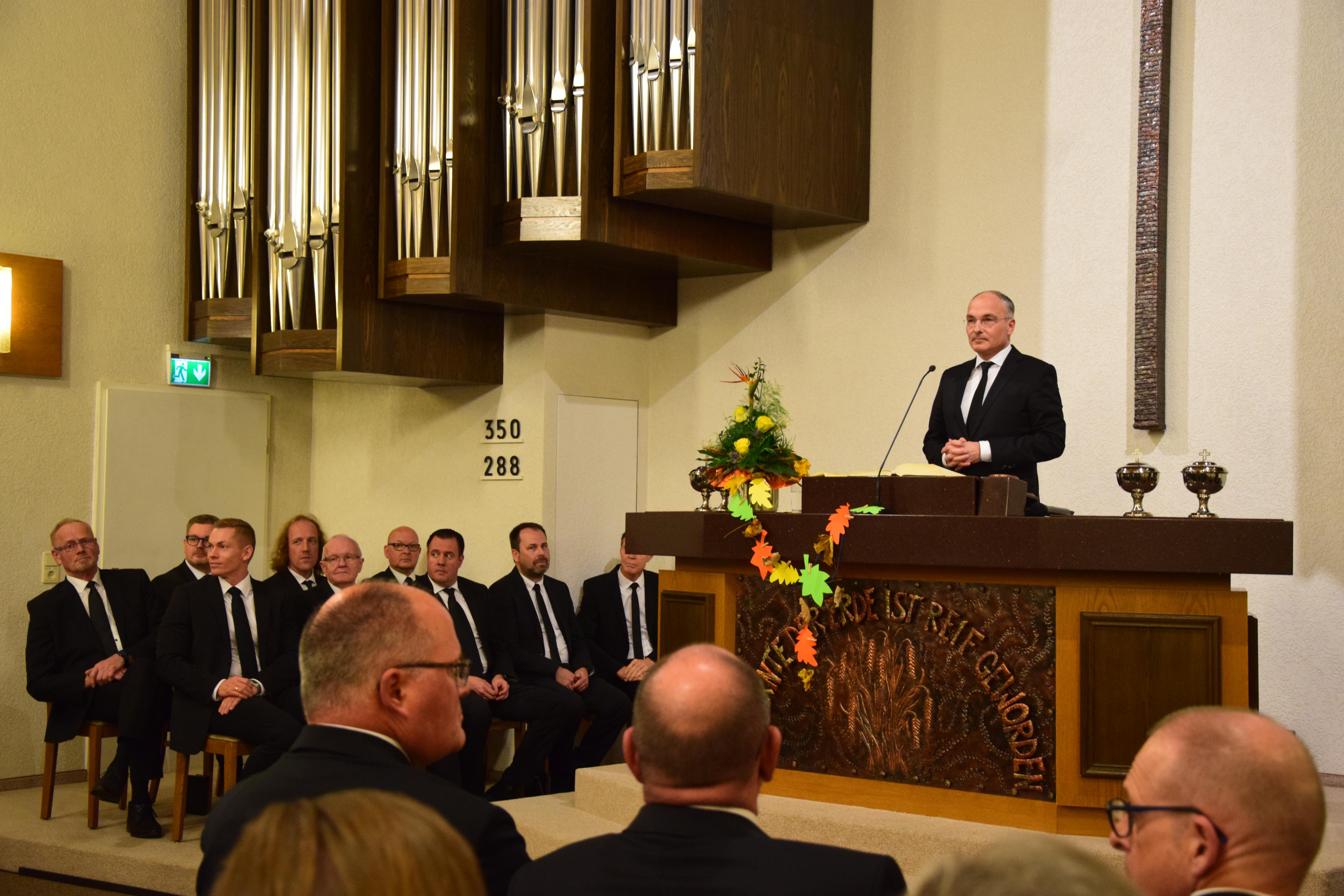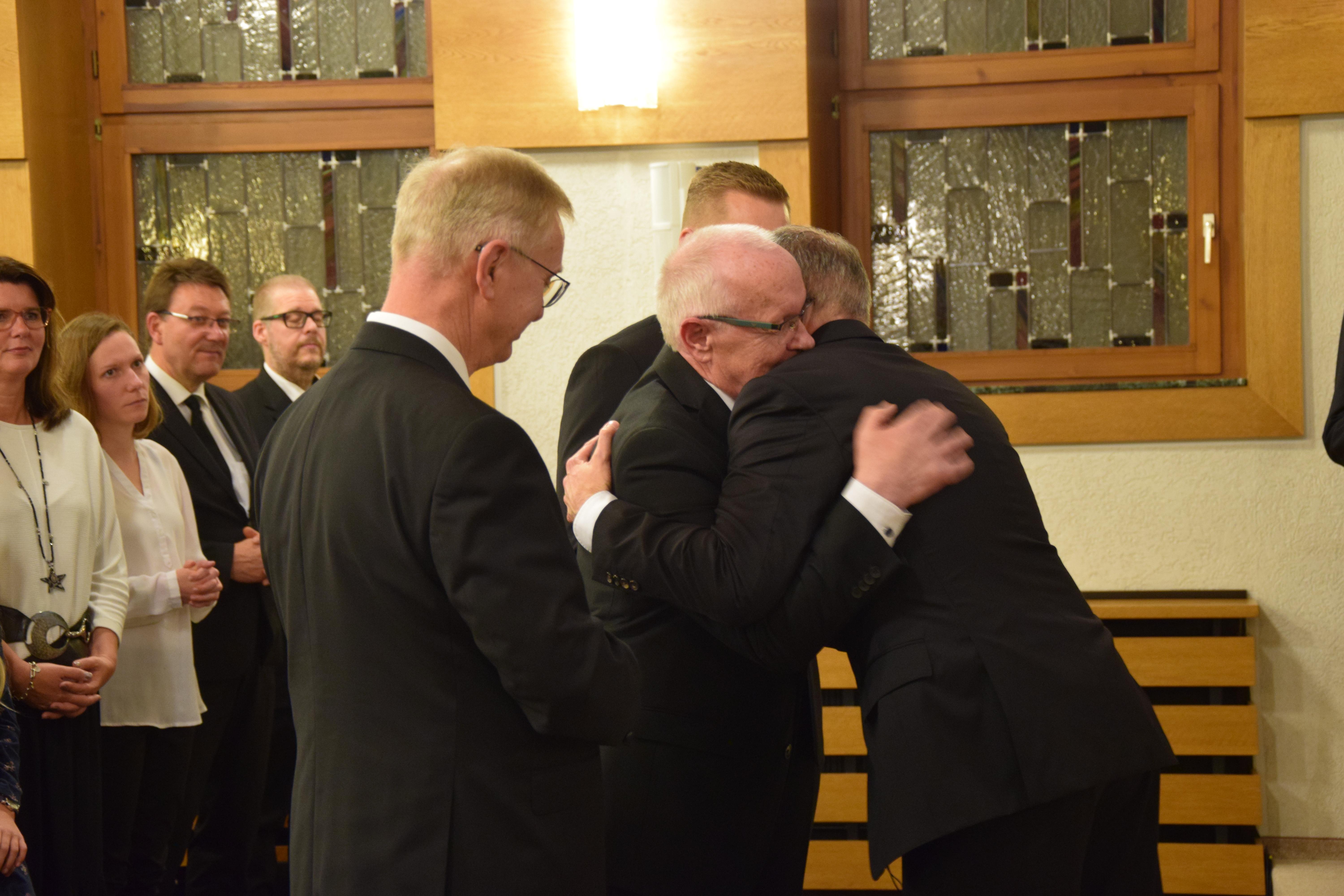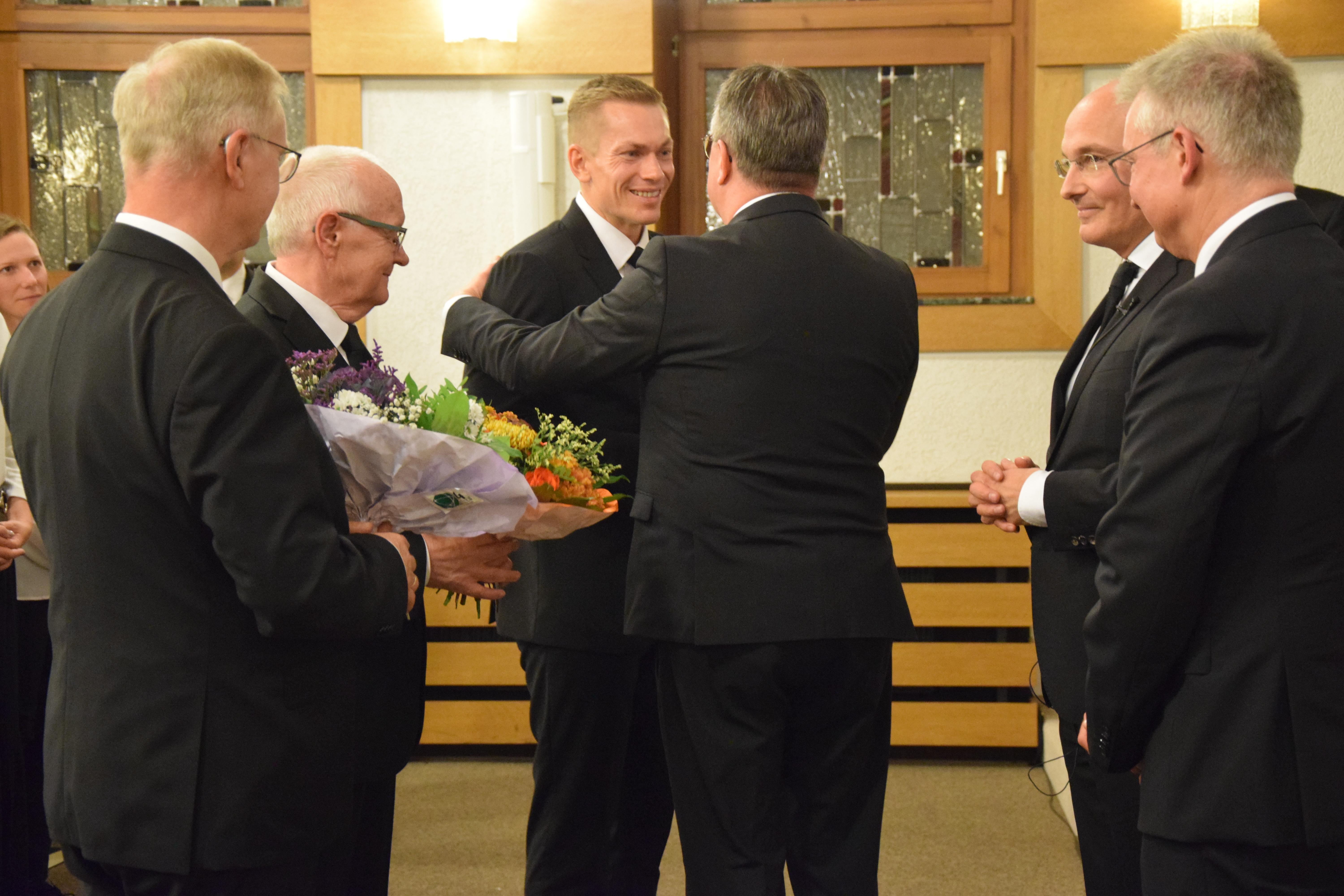 Nach der Feier des Heiligen Abendmahls versetzte der Stammapostelhelfer die beiden Geistlichen in den Ruhestand: Joachim Richter sagte vor 41 Jahren und Uwe Eggers vor 45 Jahren ihr „Ja“ zu ihrem ersten Amtsauftrag. In persönlichen, wertschätzenden Dankesworten zählte er die vielen Stationen dieser beiden Amtstätigkeiten auf, die oftmals mit weiten Wegen und großer persönlicher Opferbereitschaft der beiden ehrenamtlichen Geistlichen sowie deren Familien verbunden waren.